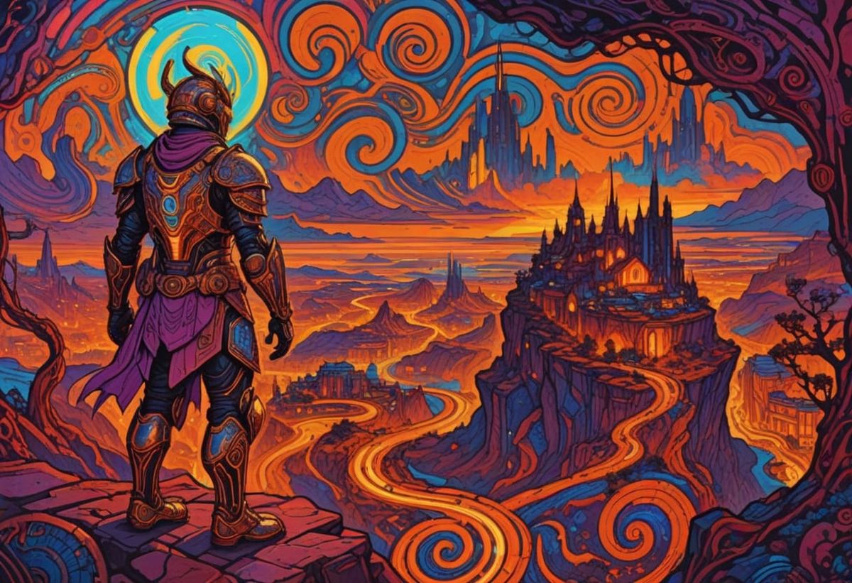 A lone cyborg warrior in glowing, ornate armor stands on a cliff. This digital painting features vibrant neon colors and surreal bioluminescence for a striking sci-fi look.