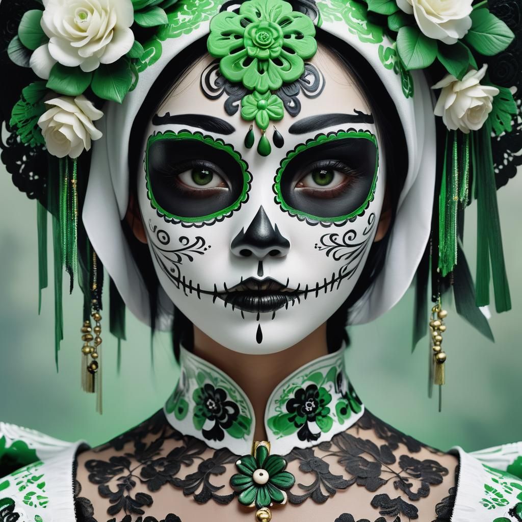 This image shows a close-up portrait of a beautiful young Chinese woman in a Catrina costume. The art style blends traditional and digital mediums, featuring gothic elements, sugar skull-inspired makeup, and a monochromatic color scheme.
