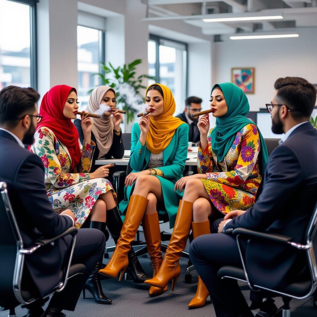 This image shows Muslim women in business attire and boots smoking cigars in a busy office with men. The scene is depicted with vibrant colors and bold patterns, in a contemporary style.