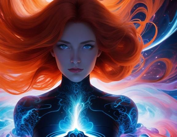 Surrealistic Masterpiece, Wide Shot. A lovely auburn-haired, blue-eyed, slightly smiling, woman, sense of power emanating from her core. Macro photography. Vibrant, swirling colors like an O'Keefe painting. Glowing, ethereal light emanating from her body. a vibrant, abstract explosion.