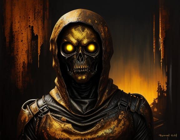 This oil painting captures an unsettling alien in an awkward, creepy outfit, its skin peeling like old leather. Golden hour light illuminates rusted metal amidst a sinister aura.