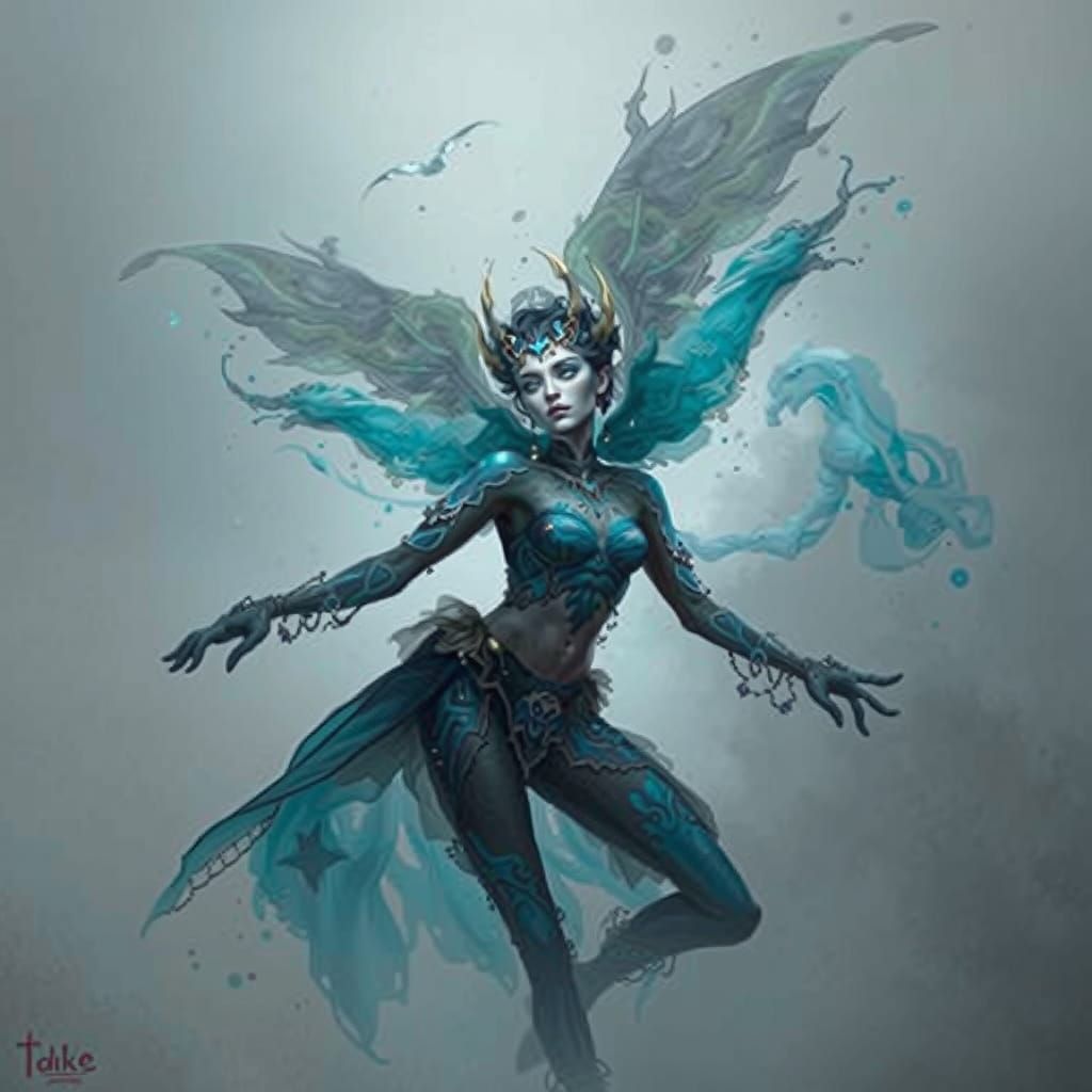A vivid digital painting of a dancer in motion. The artwork features smokey, translucent colors with turquoise and dark undertones, rendered as detailed fantasy concept art.