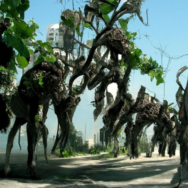 This image shows various animals journeying toward a large tree. An overgrown, vine-covered city forms the backdrop, hinting at nature reclaiming urban spaces.