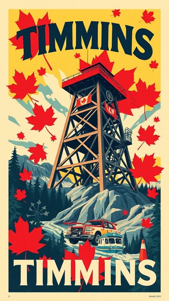 This striking poster celebrates the rich mining history of Timmins, Ontario, featuring iconic landmarks and vibrant, patriotic colors, amidst a backdrop of red maple leaves, capturing the city's dynamic energy and sense of Canadiana.