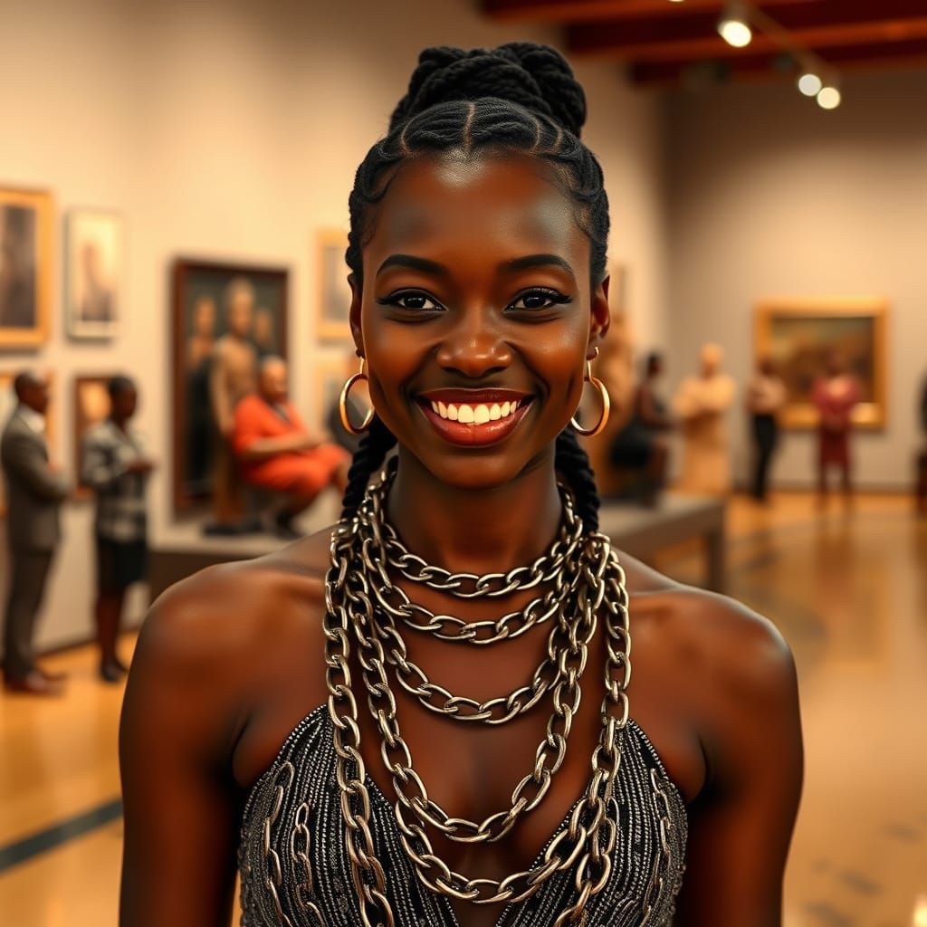 This image shows a smiling, beautiful dark-skinned Black woman wearing a dress made of metallic chains. The background features an African American museum.
