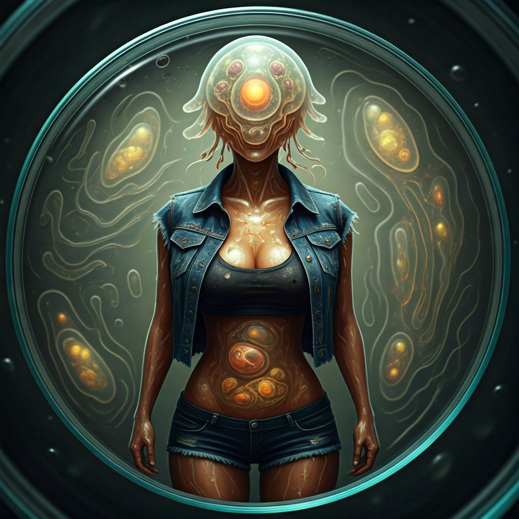 This image shows a detailed, anthropomorphic she-amoeba with a protoplasmic face and glowing nucleus, posing in a petri dish. It wears a filthy denim vest and shorts, with an agar background. Intricately detailed scuzzpunk style.