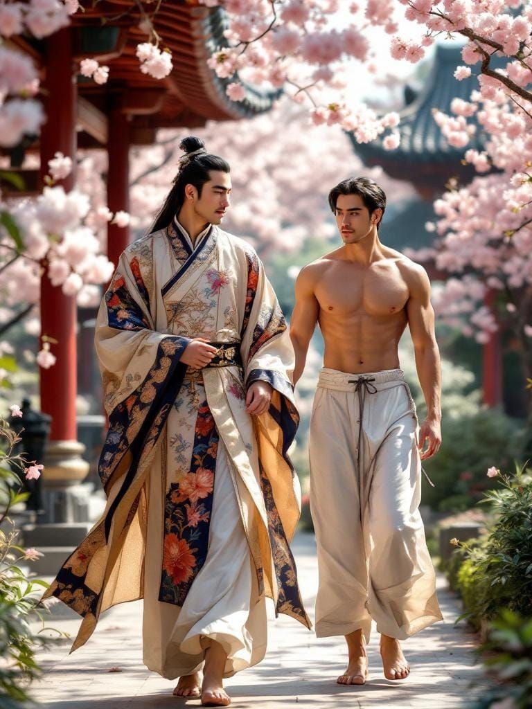 This image shows an Asian prince in traditional clothing walking through a palace garden filled with cherry blossoms, accompanied by a barefoot servant. The scene is rendered with vibrant colors, reminiscent of digital painting.