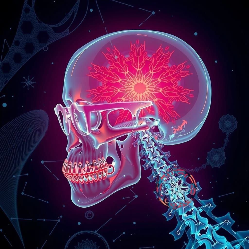 glowing, intricate, hexagonal patterns, coral, deep violet, Salvador Dali, and Frida Kahlo X-ray of a human skull with glasses, illuminated by an ethereal glow, rendered in the style of a private X-ray scan with intricate skeletal and structural details, layered with translucent overlays of soft blues, ...
