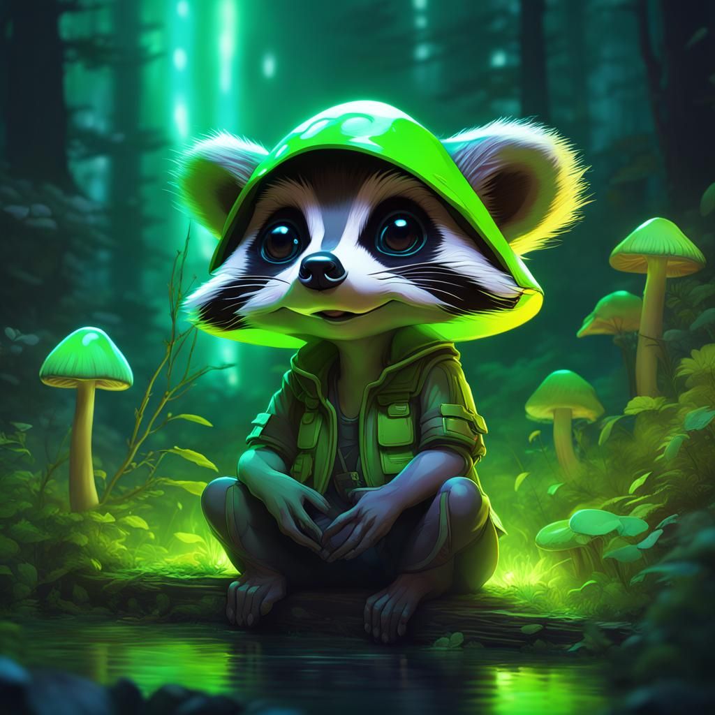 A vibrant image of a chibi raccoon nestled among glowing neon green mushrooms at night. This highly detailed digital artwork features dynamic lighting and a vivid triadic color scheme.