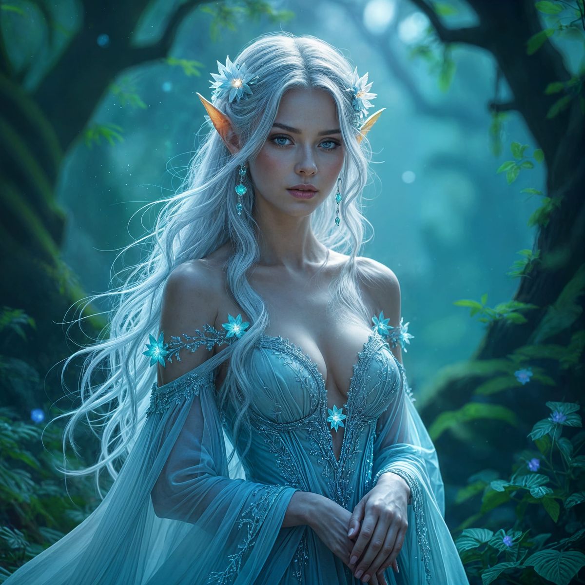 A stunning image of an Elven woman with silver hair and bioluminescent flowers, wearing an intricate gown in a magical forest. The art blends ethereal and dreamy qualities.