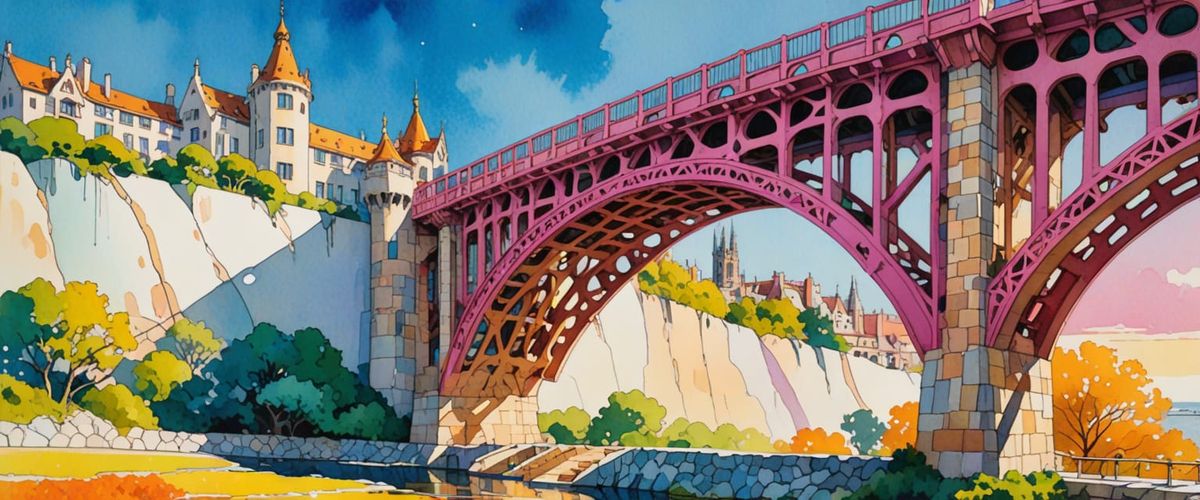 A vibrant and cheerful bridge illustration featuring a blend of organic architecture and comic book aesthetics, bathed in bright late afternoon sunlight.