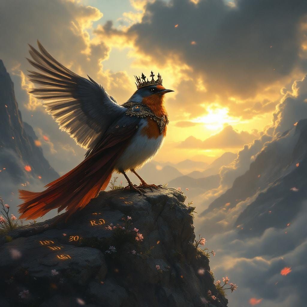 A dramatic image of a robin dressed as royalty on a cliff at sunrise. Golden light illuminates the bird against stormy skies, with cherry blossoms and distant mountains in view, in a cinematic style.