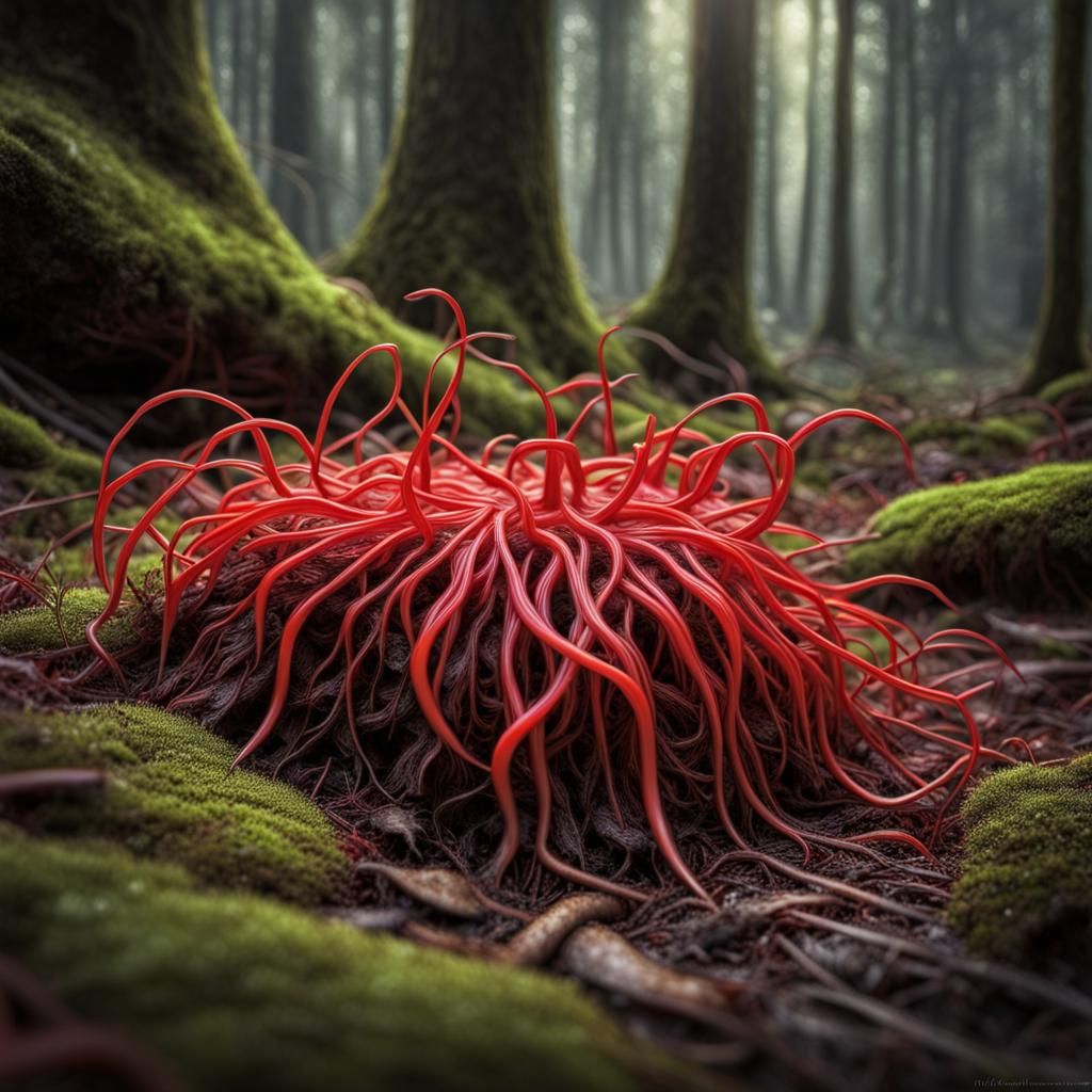 A hyperrealistic image showing red mould growth with tendrils reaching out across a forest floor. The scene has intricate details, high contrast, and an atmospheric, cinematic mood.