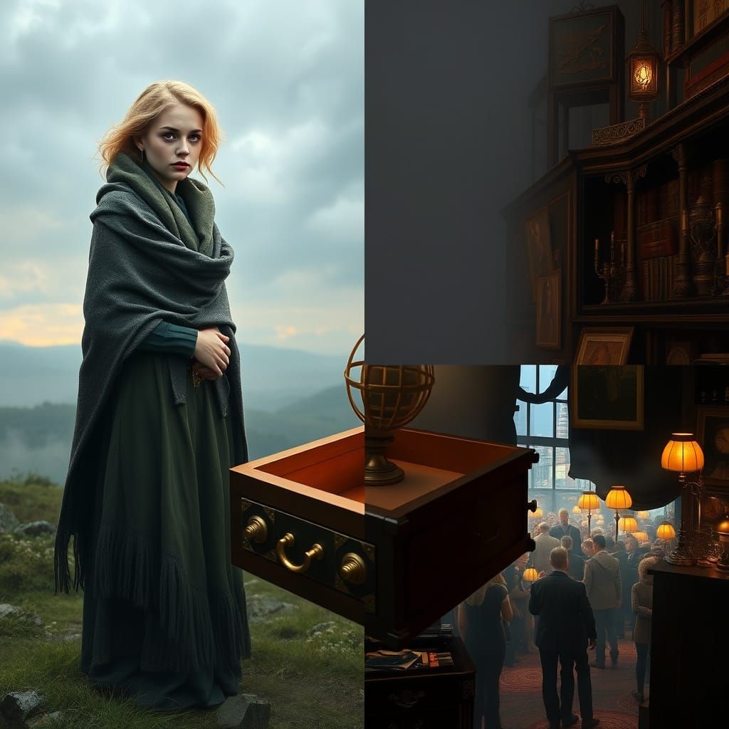 This haunting image depicts a young woman with strawberry blonde curls standing alone on a vast, misty moor, lost in thought as melancholic music drifts through the air. The Pre-Raphaelite-inspired artwork features intricate textures and atmospheric lighting, evoking a sense of mystery and longing.