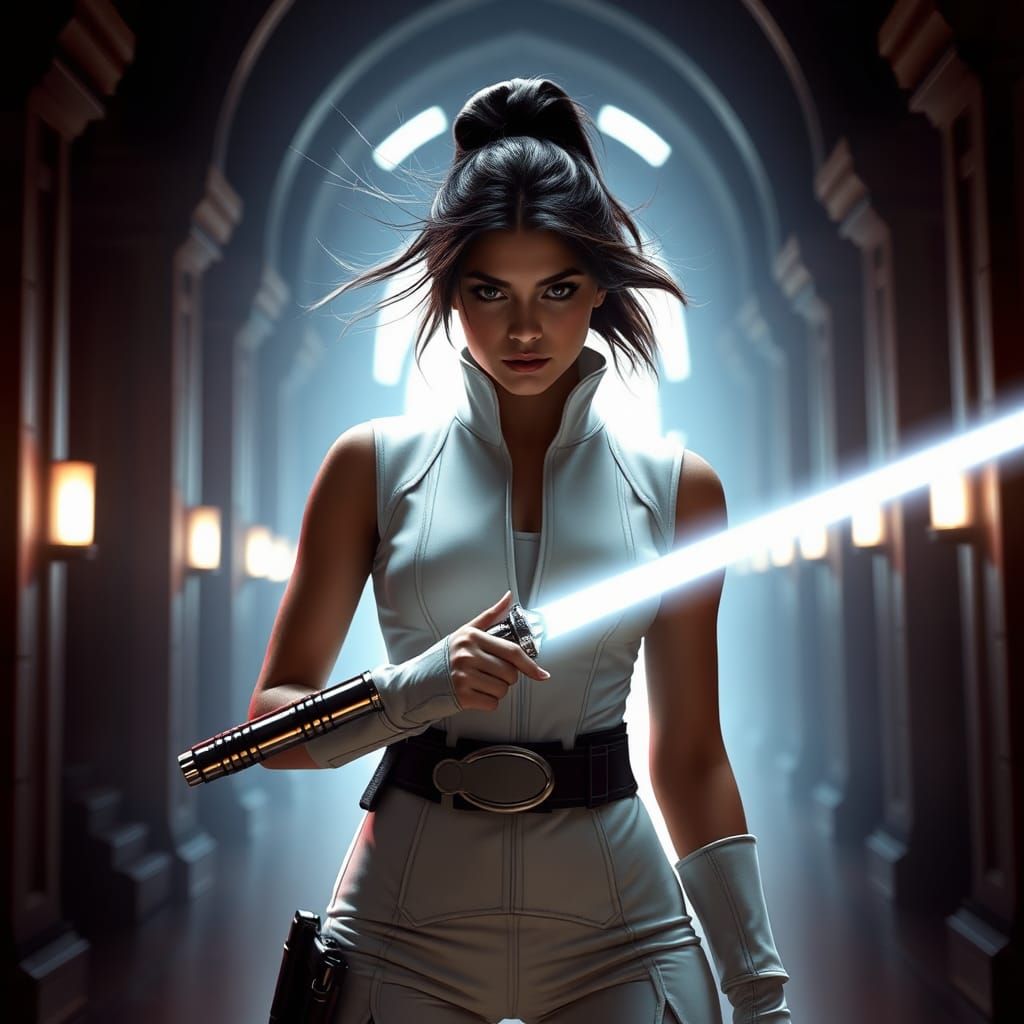 This image shows Kylie Jenner as a Jedi Master in a dimly lit Jedi Temple corridor. She is wearing a white jumpsuit and grasping a lightsaber hilt, rendered with hyper-realistic detail.