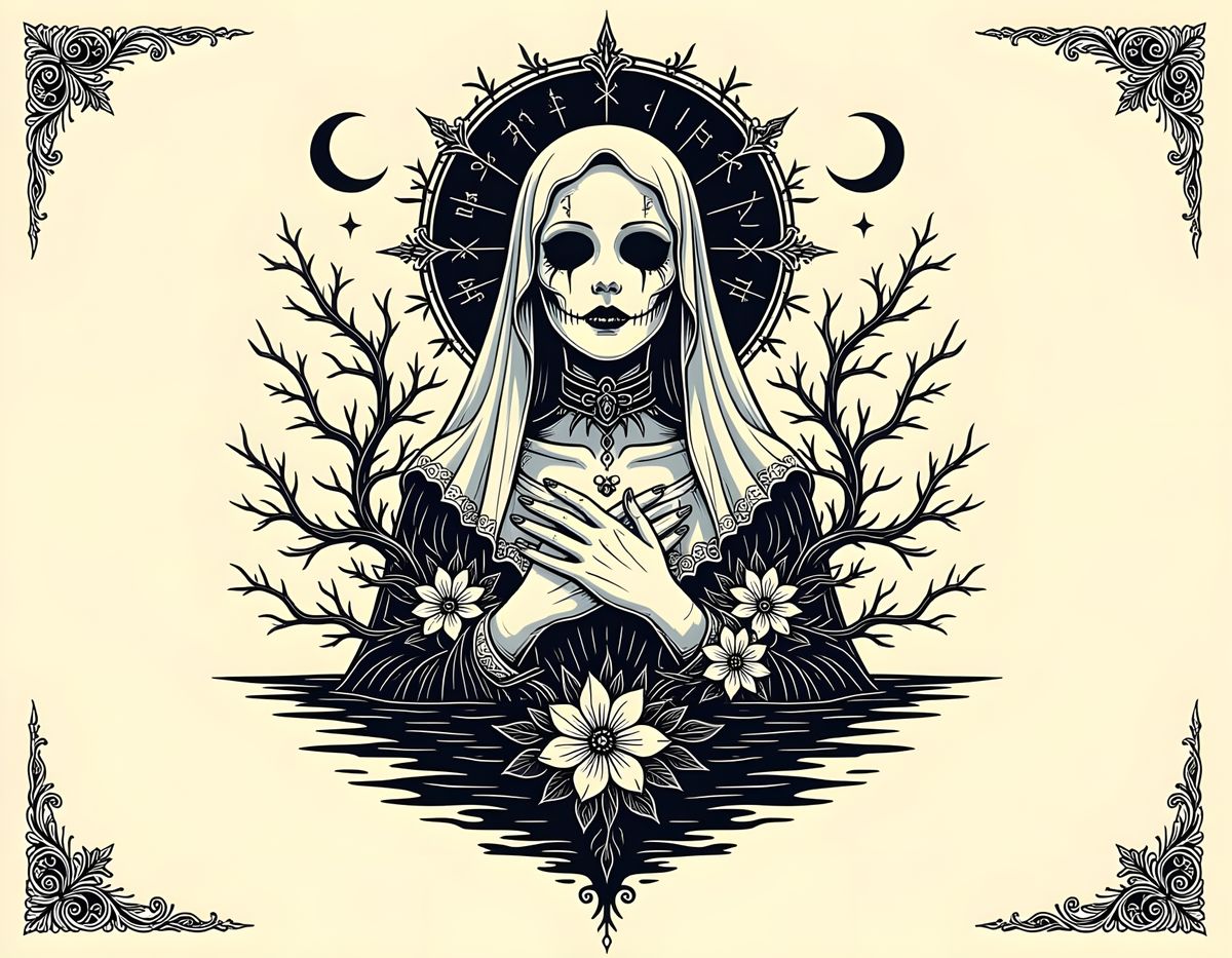 Detailed horror art. Medium shot. A ghost bride with a shattered porcelain face floats above a black ocean, clutching a bouquet of thorny vines and luminous blossoms. Sinister shadows and mystic runes, formulas, and symbols. Reminiscent of H.R. Giger, high contrast, best quality, a masterpiece, 8k resolution.