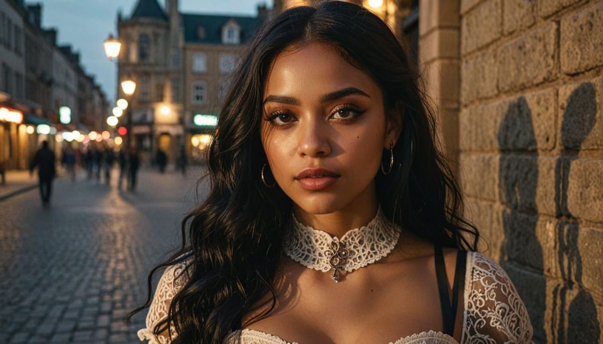 A striking picture of a young Dominican woman in a sensual dress posing in a city. Neo-gothic portrait photography with dramatic shadows and warm golden hour lighting.