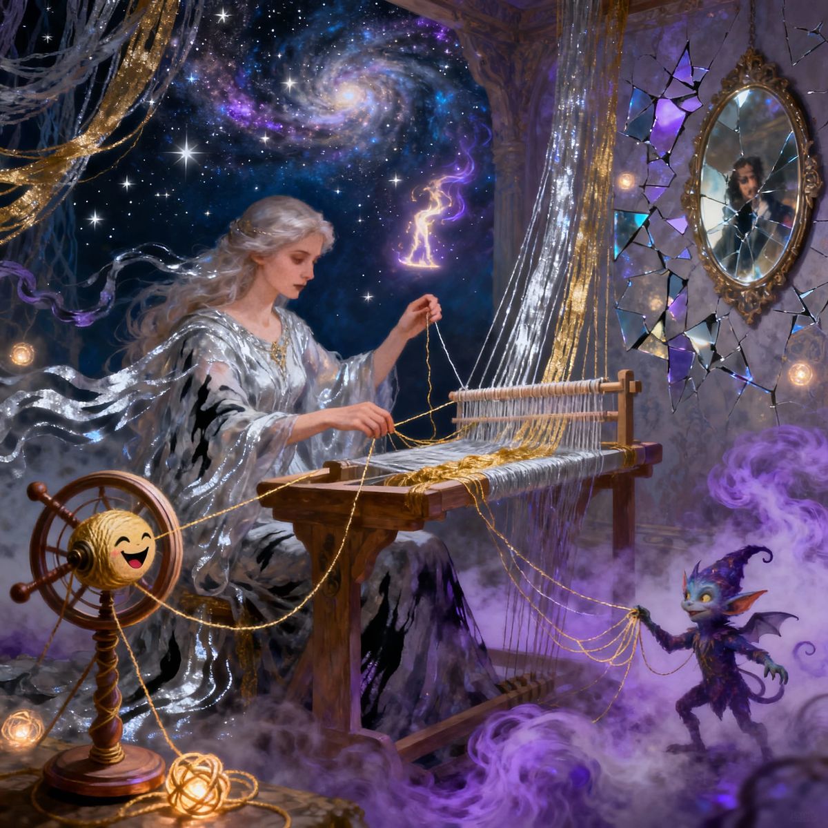 This image depicts a mystical weaver at the Loom of Ages, manipulating threads of fate amidst swirling mist and starlight. The scene features glowing knots and a nebula of shimmering possibilities, rendered in a palette of silver, indigo, and gold.