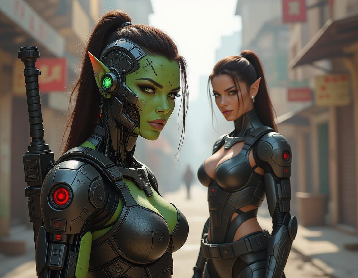 This image depicts a striking half-orc cyborg woman with green skin and cybernetic enhancements, rendered in a Renaissance painting style with dramatic lighting and anatomical detail.
