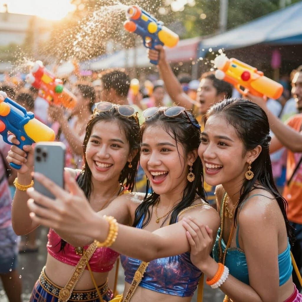 This image captures three young Thai women taking selfies during the vibrant Songkran water festival, with others enjoying water gun fights in the background.