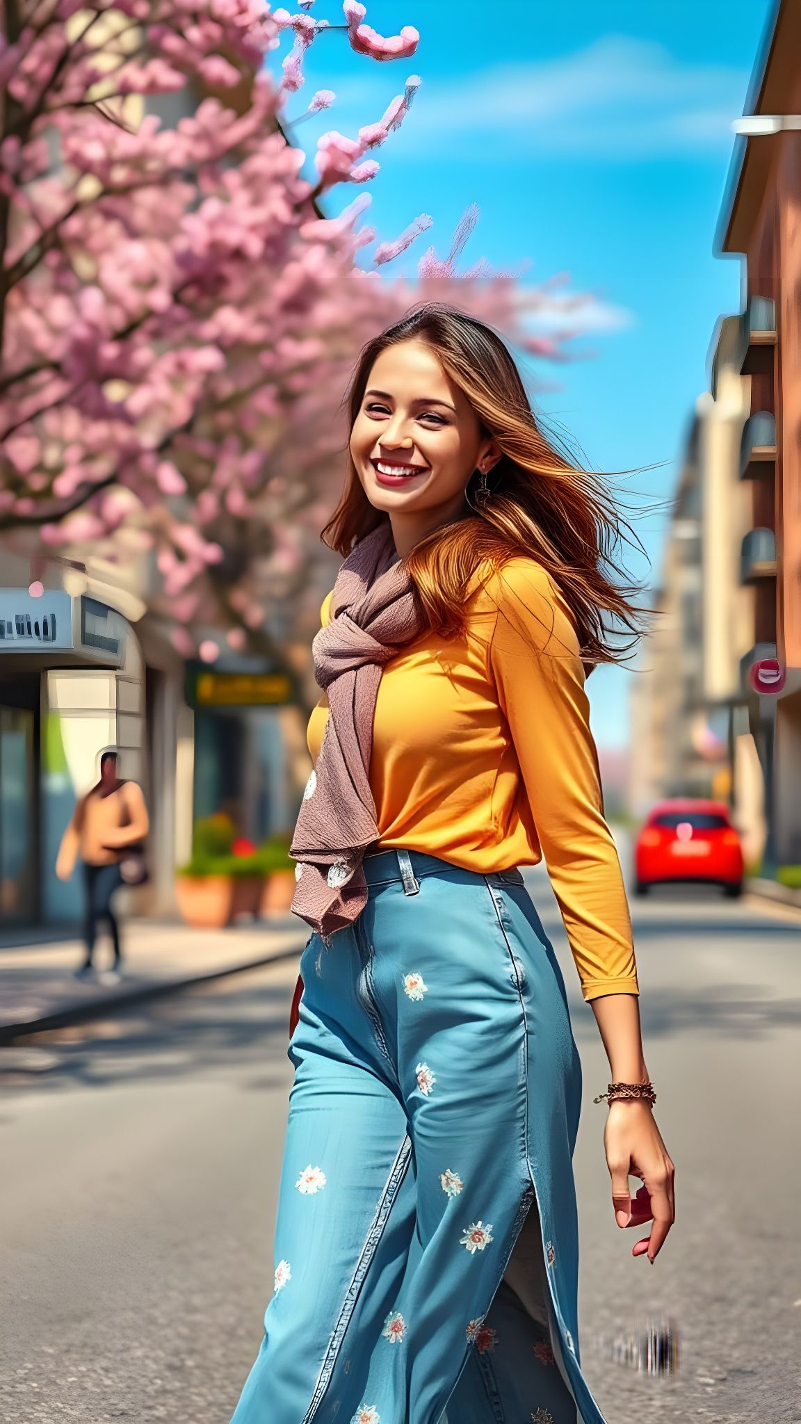 This image captures a serene spring day in a European city, where a smiling woman strolls along a road surrounded by a kaleidoscope of colors and intricate details.
