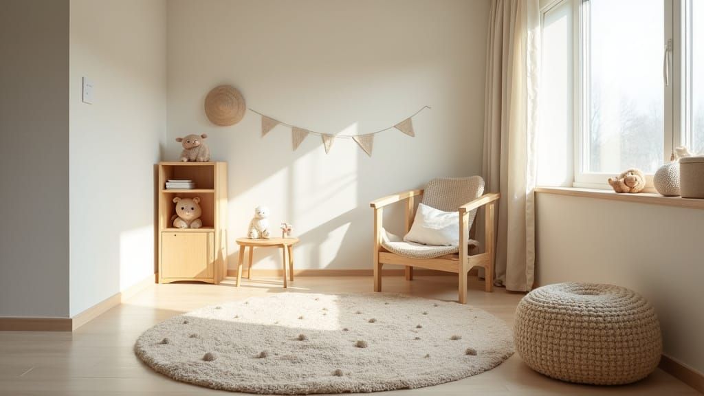 This image shows a minimalist baby room filled with natural light. The modern design incorporates eco-friendly materials to create a sustainable and charming infant care space captured with a wide-angle lens.
