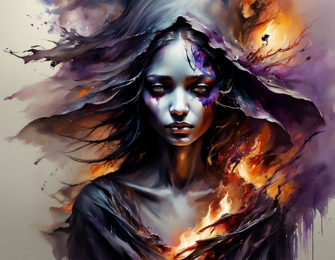 A surreal watercolor scene depicts a witch engulfed in a bonfire, with glowing embers on dark skin. Ethereal purple mist and soft golden light create a mesmerizing, cinematic effect.