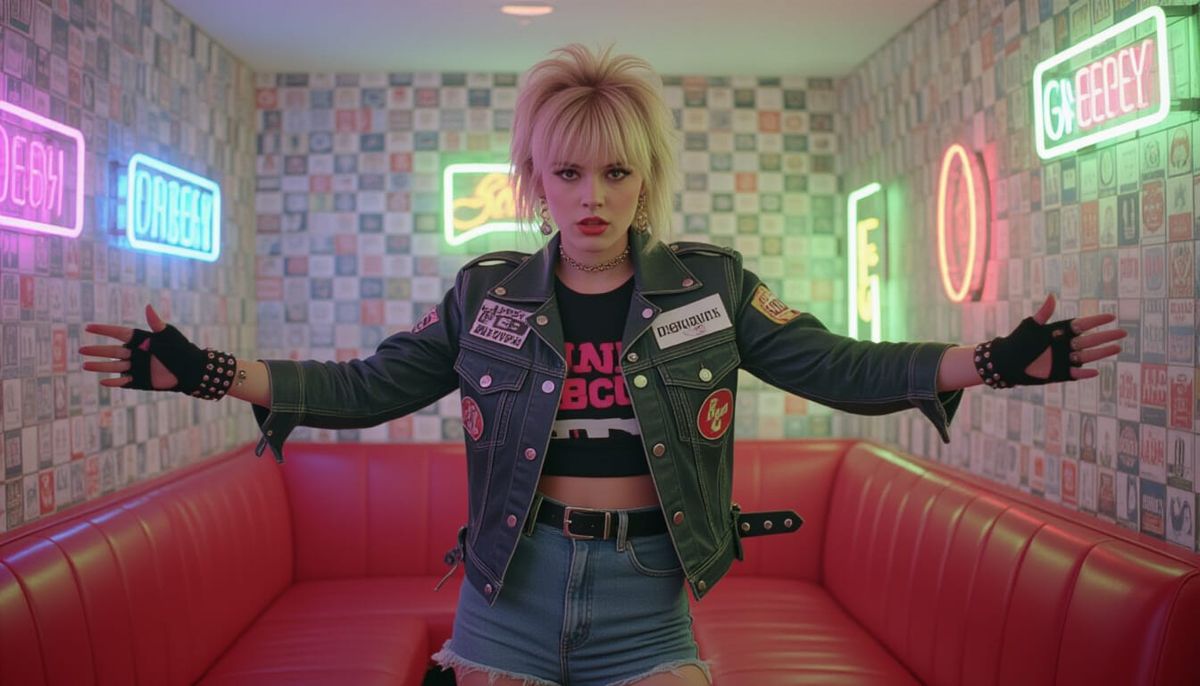 This image shows a teenage girl in an 80s punk-inspired outfit. The photo has a retro, dream-pop aesthetic with analog imperfections such as film grain, light leaks and soft focus.