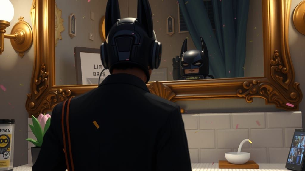 This image shows a young adult dancing in a vibrant nightclub surrounded by flashing lights and confetti, with a playful Lego Batman watching from a nearby table, blending neon-lit cyberpunk and comedic cartoon elements in a unique and humorous style.