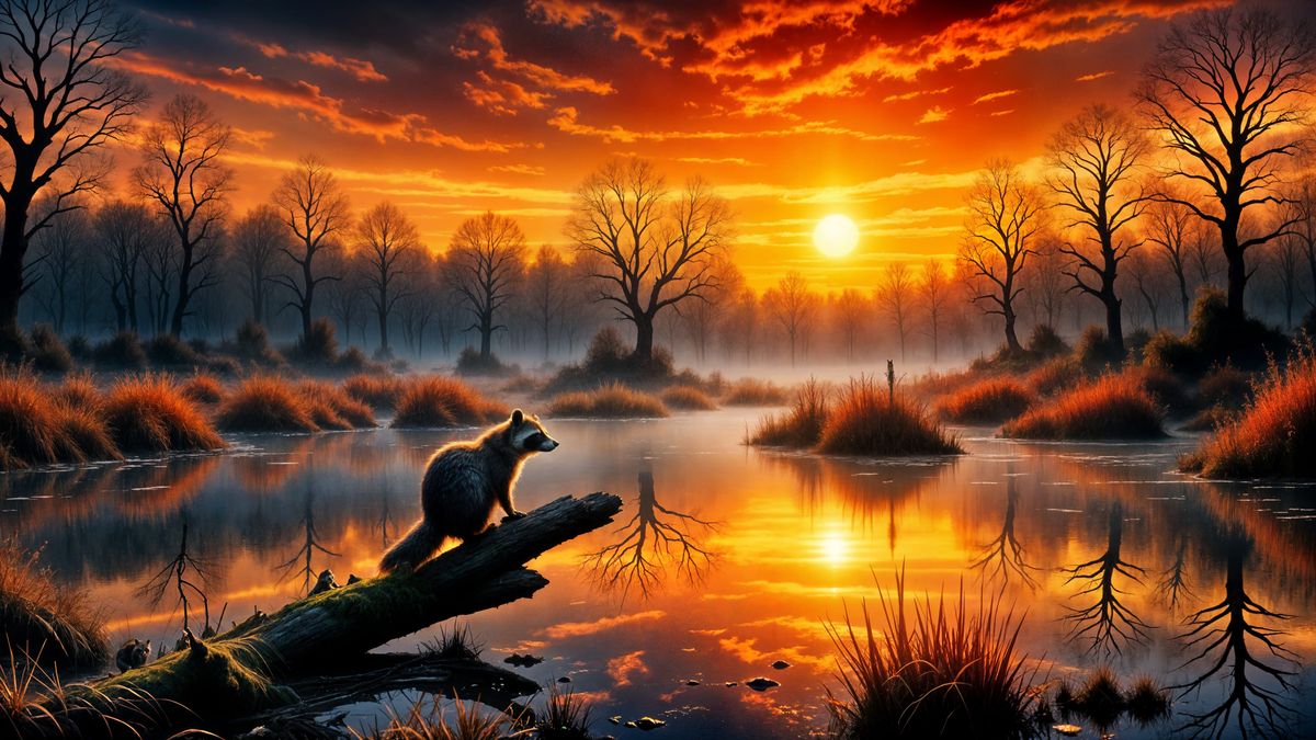 This image shows a raccoon perched on a mossy log in a mystical swamp at sunset. The sky is a blend of orange, crimson, and gold, mirrored in the water, creating an atmospheric, cinematic scene.