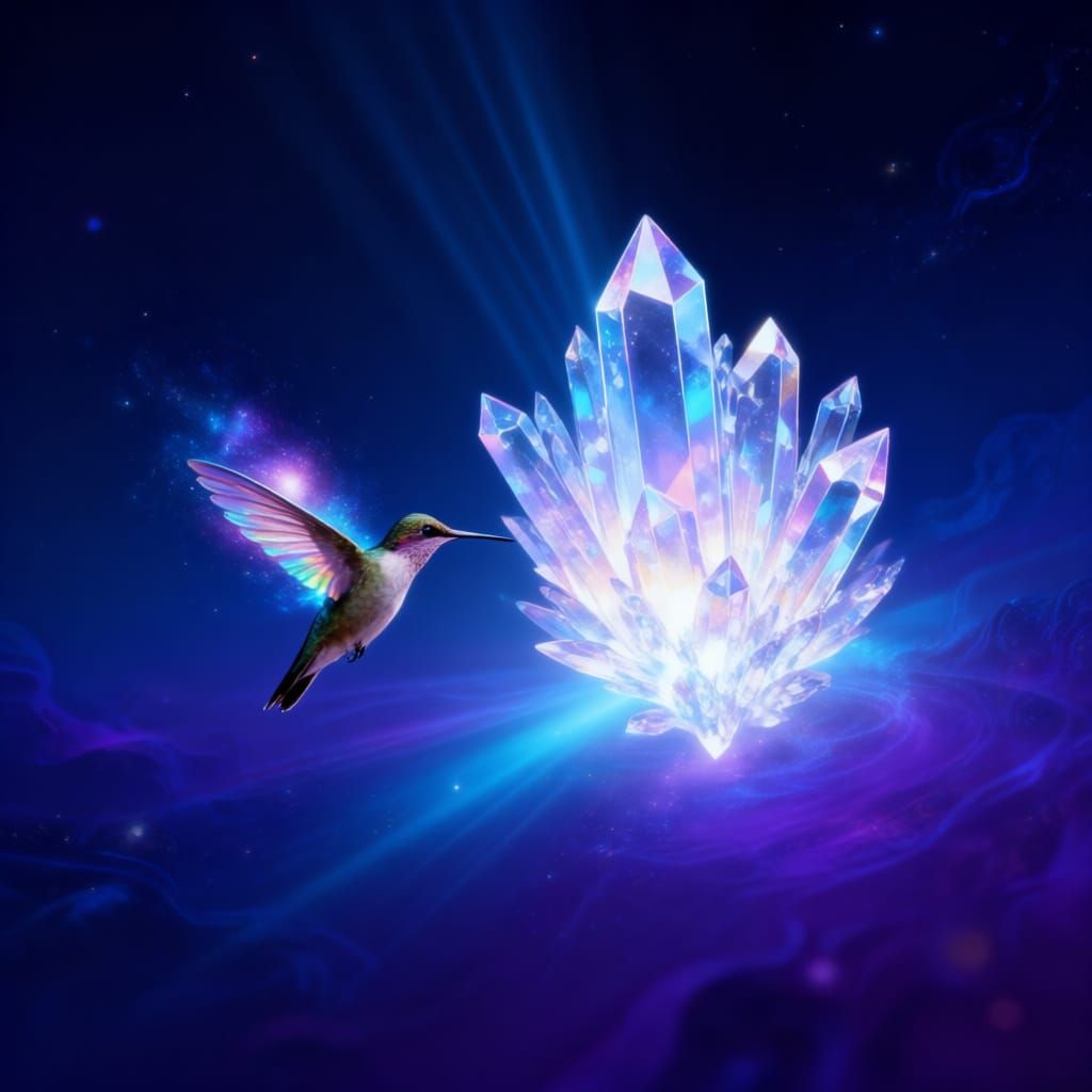 A solitary hummingbird, its wings shimmering with iridescent, cosmic energy, hovers before a colossal, crystalline flower that blooms in the void of space. The flower pulses with gentle light, casting ethereal rays. This is a digital painting, evoking surrealism with intensely moody and dramatic lighting. ...