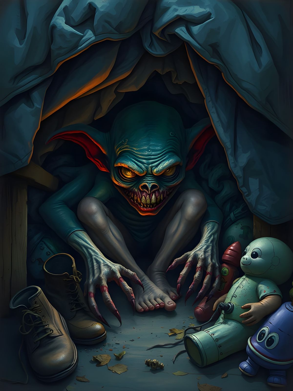 This image shows a nostalgic depiction of a monster hiding under a bed, reminiscent of childhood fears and imagination.