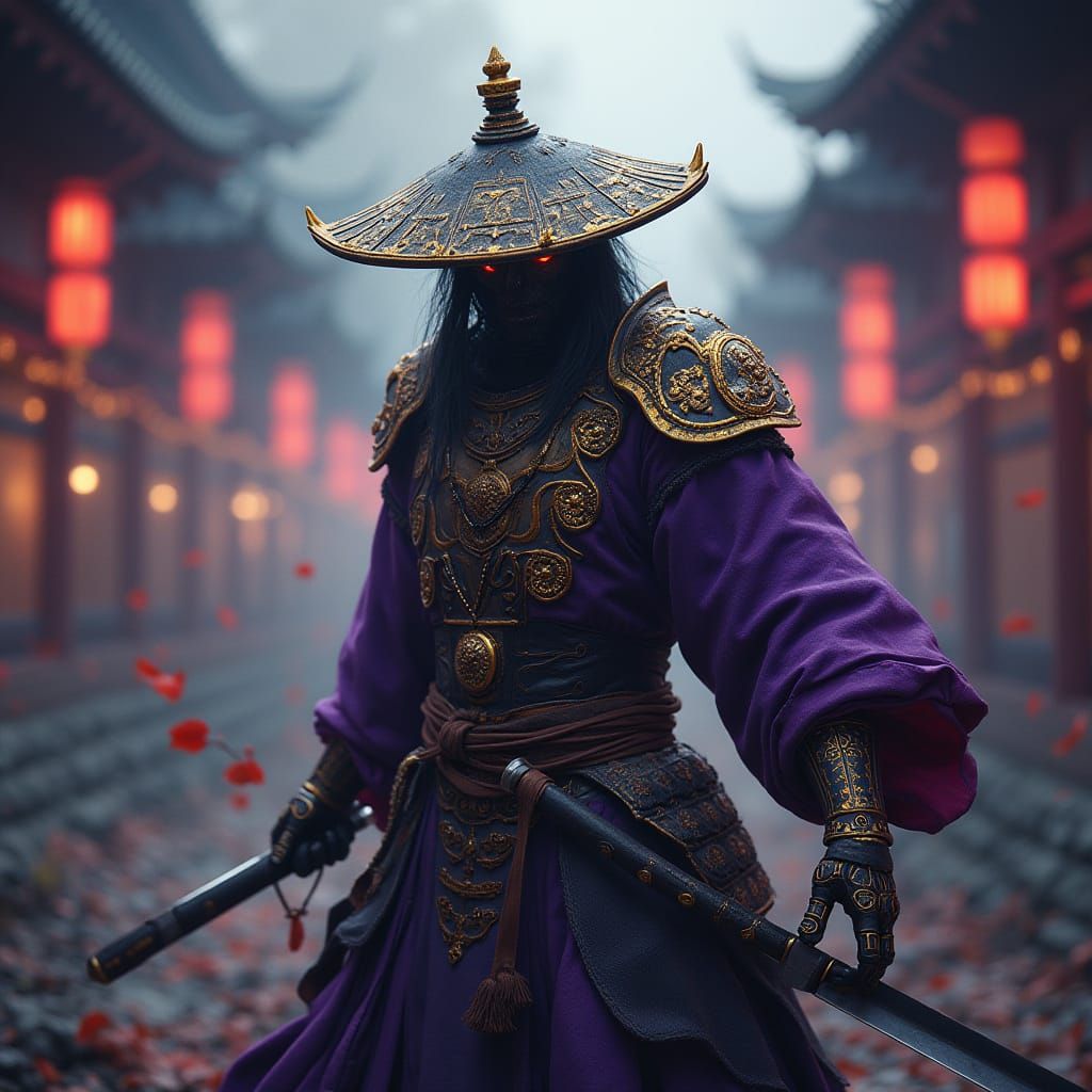 A dramatic image of an undead Shinsengumi warrior in a mystical Japanese setting. The scene features dynamic lighting, detailed textures, and vibrant purple and yellow complementary colors, evoking a cinematic and fantasy aesthetic.