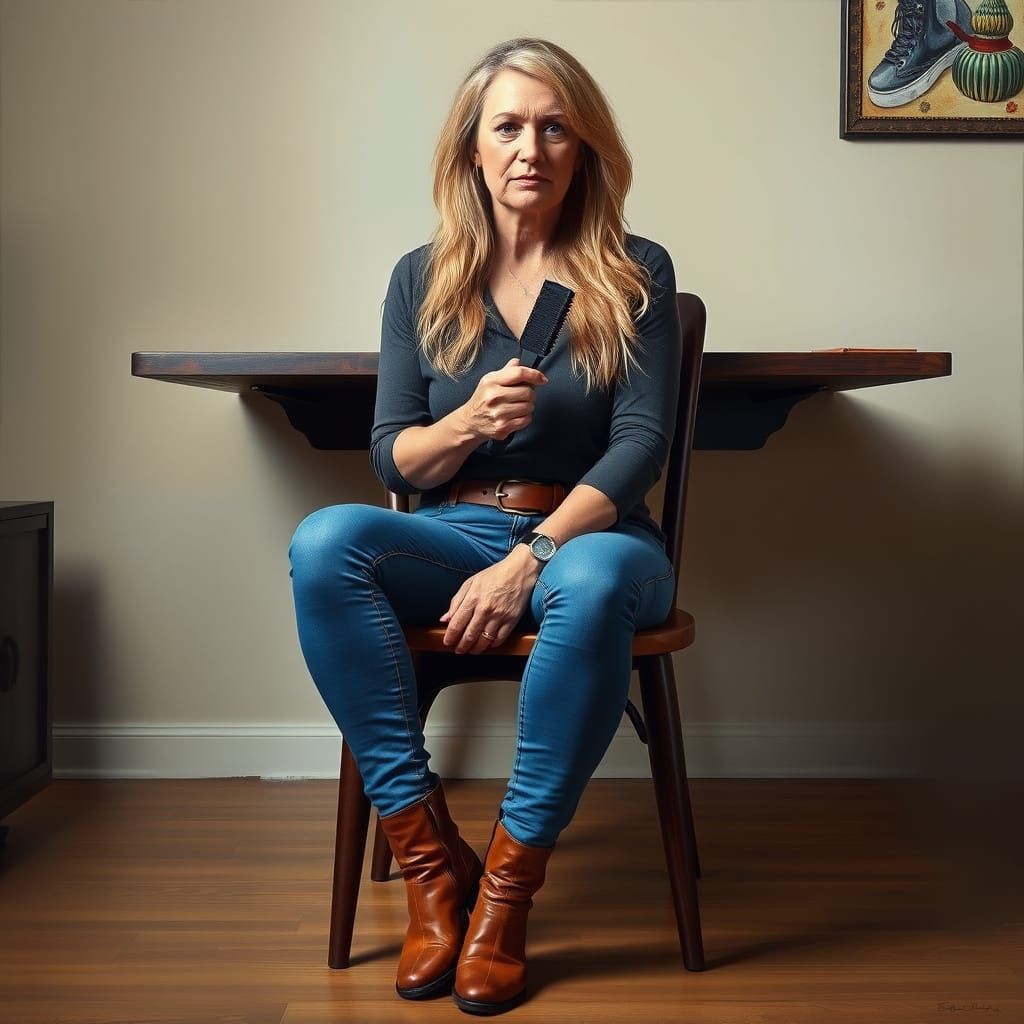 A photorealistic image of a mature woman with long blonde hair, wearing jeans and boots, sitting on a dining chair and holding a hairbrush. The artwork blends bold brushstrokes with hyper-realistic detail.