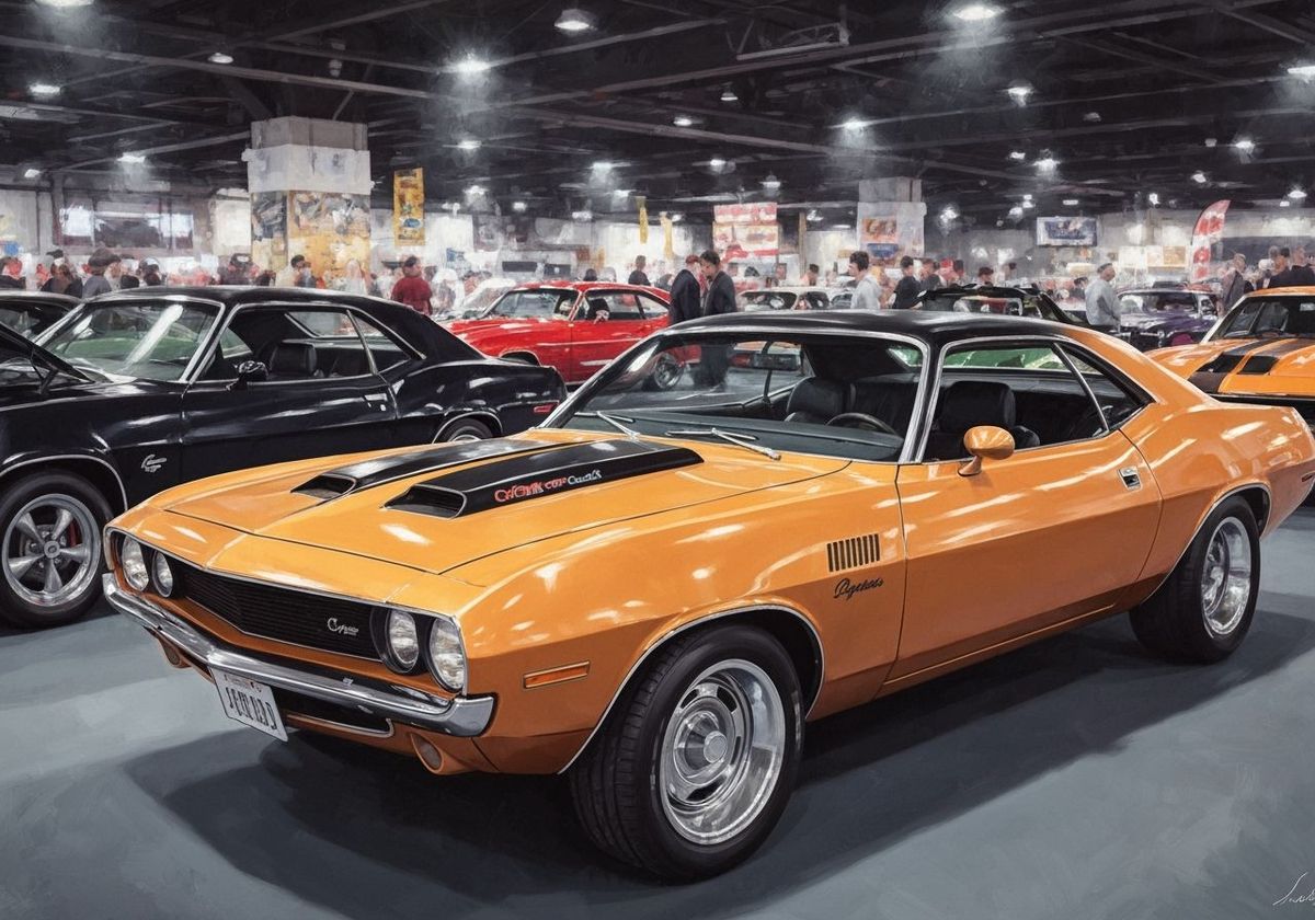 A painterly depiction of iconic muscle cars, including a '71 Hemi 'Cuda and a '68 Camaro SS, gleaming under spotlights at a bustling indoor car show.