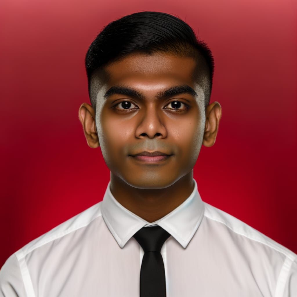 This image shows a professional studio portrait of a young man with short black hair. The close-up shot features natural skin texture, set against a plain red background. The style resembles a lifelike photograph with sharp details and ambient light.