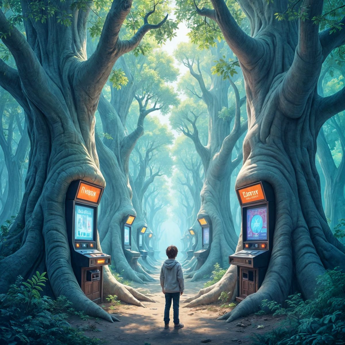 This image depicts a hyper-detailed futuristic forest where ancient trees with white bark, resembling brain-like patterns, integrate arcade machines and glowing screens. A teen sits absorbed in a screen, exploring consciousness.