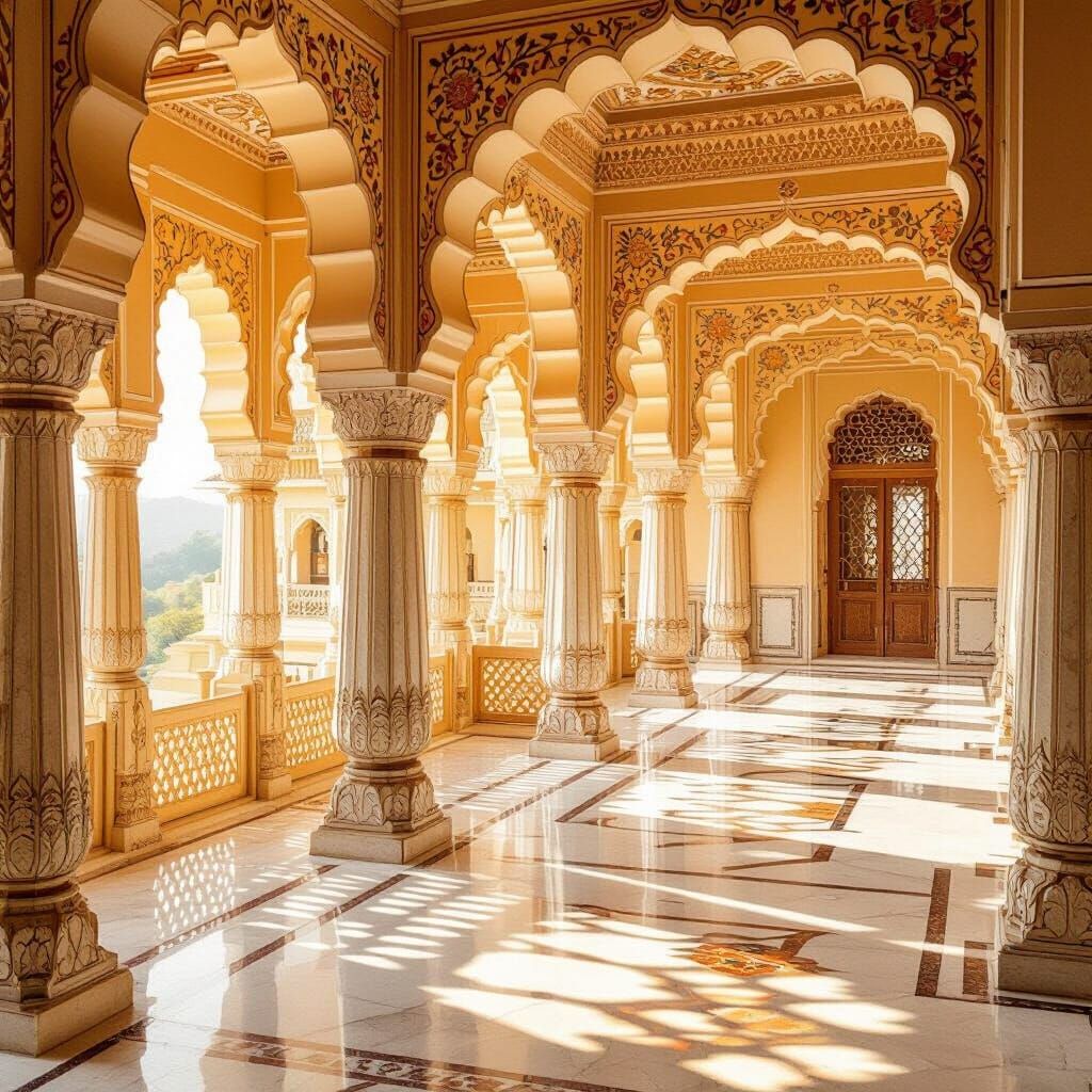 A view of a majestic Rajasthani Indian palace interior filled with opulent details and warm golden light. The aesthetic blends Indian modernism with ornate and luxurious elements.