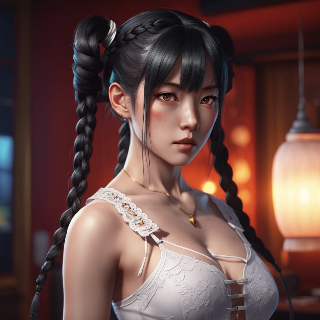 This image shows a stunning Asian woman in a provocative pose, set against a dramatic dark background. Created in 3D anime art style with ultrafine detail and breathtaking realism, this artwork is a masterpiece of concept art.