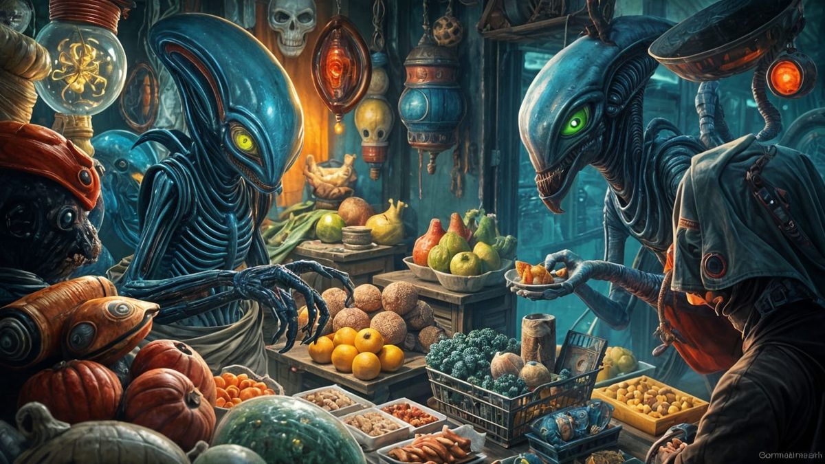 This image shows an alien market stall filled with glowing foods and strange artifacts. A multi-limbed alien merchant offers a sample to a shopper in this vibrant fantasy concept art.