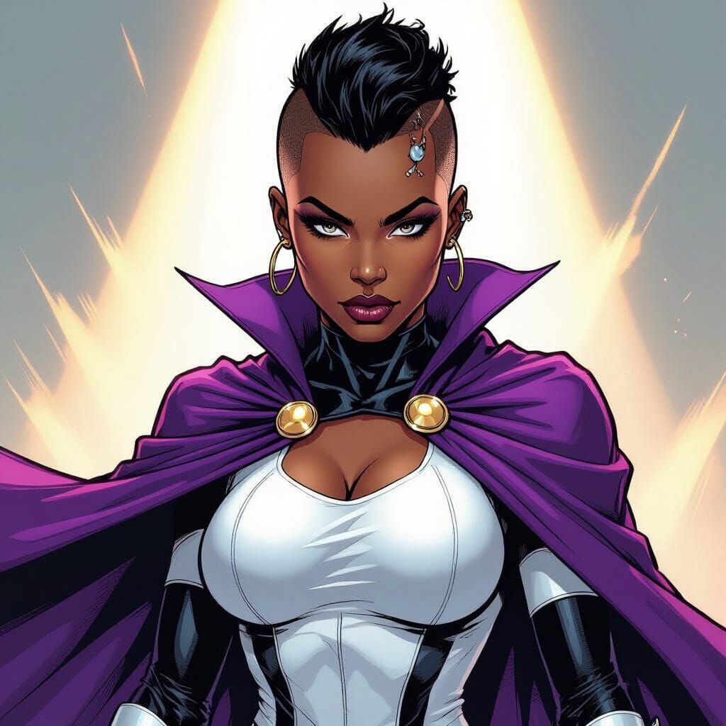 This image depicts a strong Black female superhero with a shaved head and piercings, wearing a white and purple costume and cloak. Rendered in a dramatic comic art style with bold linework and chiaroscuro lighting.