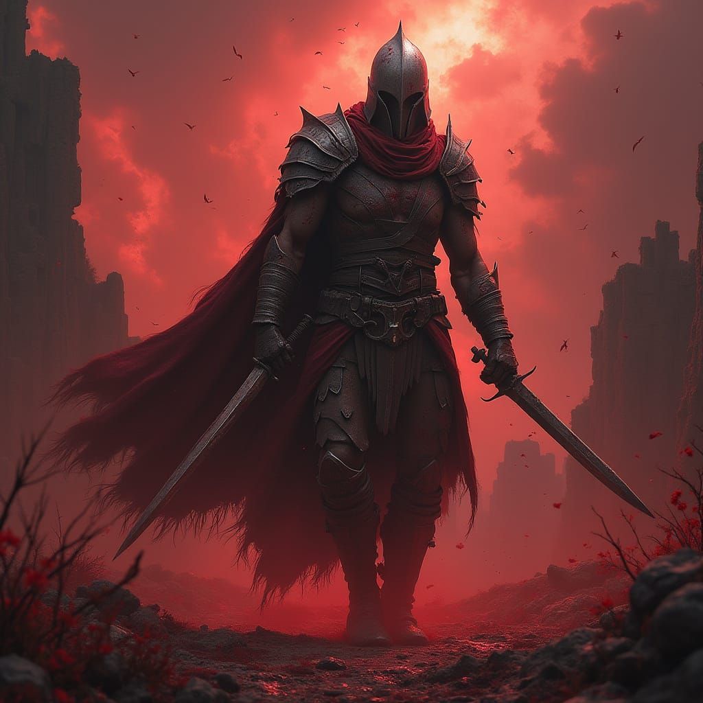 A dark fantasy artwork featuring a powerful warrior amidst ruins, surrounded by carnage, with a dramatic sky and detailed, realistic armor, set against a backdrop of dusty, crimson tones and deep shadows.