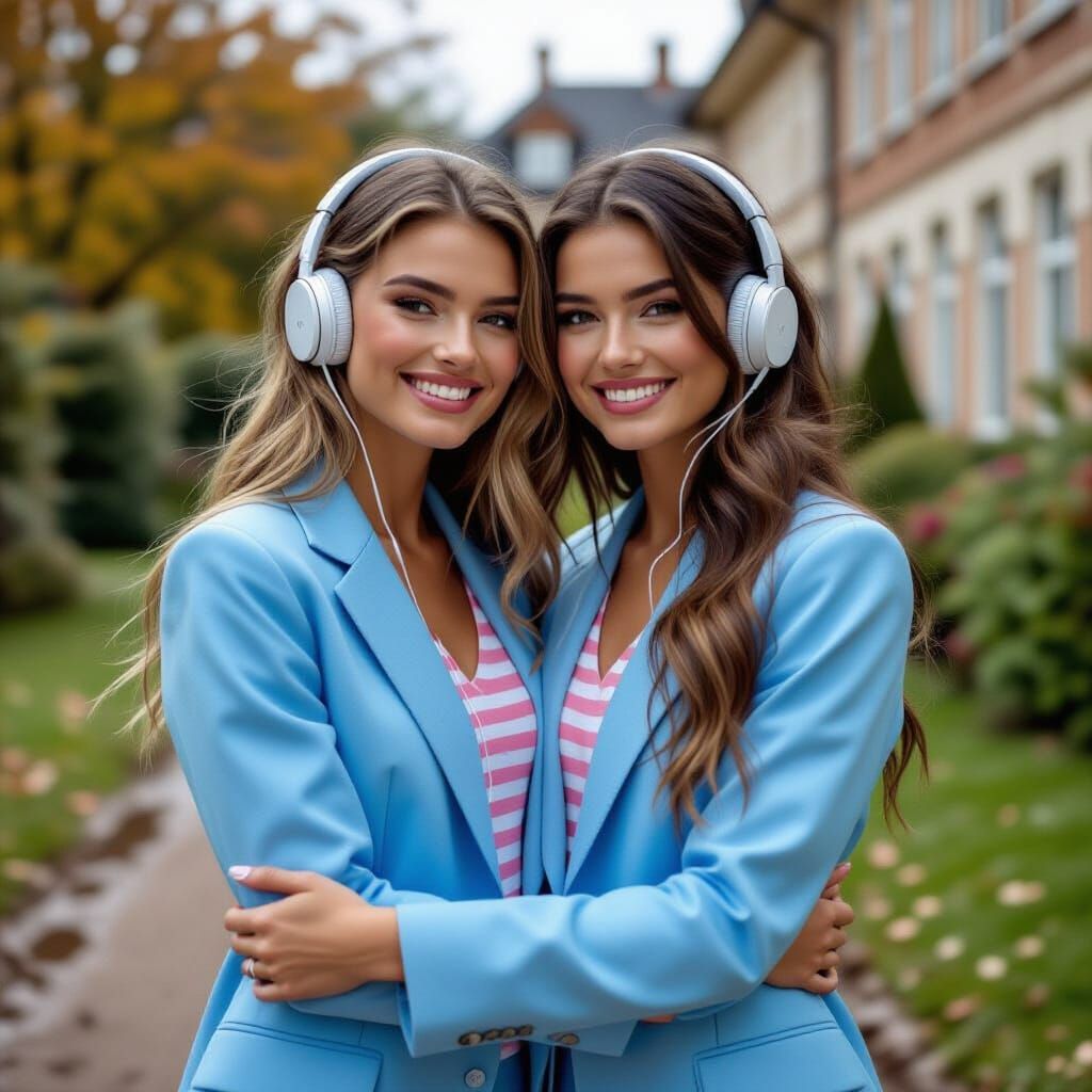 This image shows two young French supermodels hugging in a muddy garden setting. The photograph captures a naturalistic scene with vibrant colors and intimate lighting, in a photorealistic style.