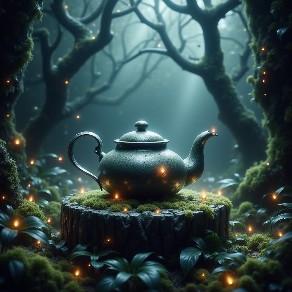 An ancient teapot rests on a mossy pedestal in a glowing, misty forest. Ethereal light illuminates strange plants, creating a dreamlike, mysterious scene with hyper-realistic detail.