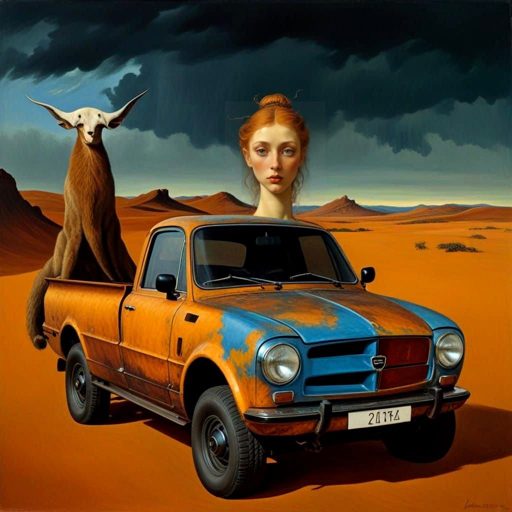 Wonderfully Surreal piece. Wondering what the creature in the flatbed of the truck could be.