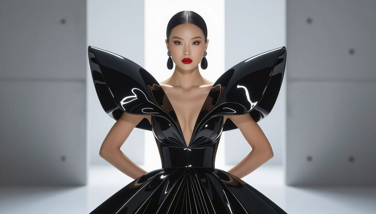 A hyperrealistic portrait of an Asian supermodel in a futuristic, glossy black gown with sculpted shoulders. Dramatic lighting highlights luxurious textures and avant-garde obsidian earrings against a minimalist concrete backdrop.