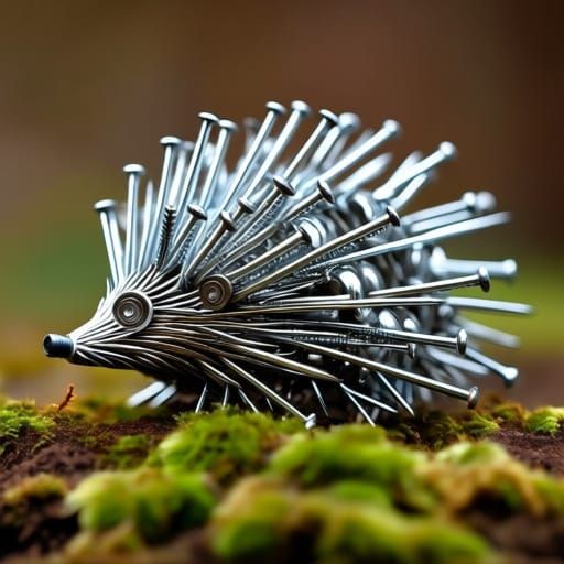 Super macro photography: a mechanical [ porcupine sculpture] made of shiny reflective silversteel screws and nails, resting on mossy soil Intricate, highly detailed object, metal threads and bolts, captured in high resolution. Leonid Afremov, Ismail Inceoglu