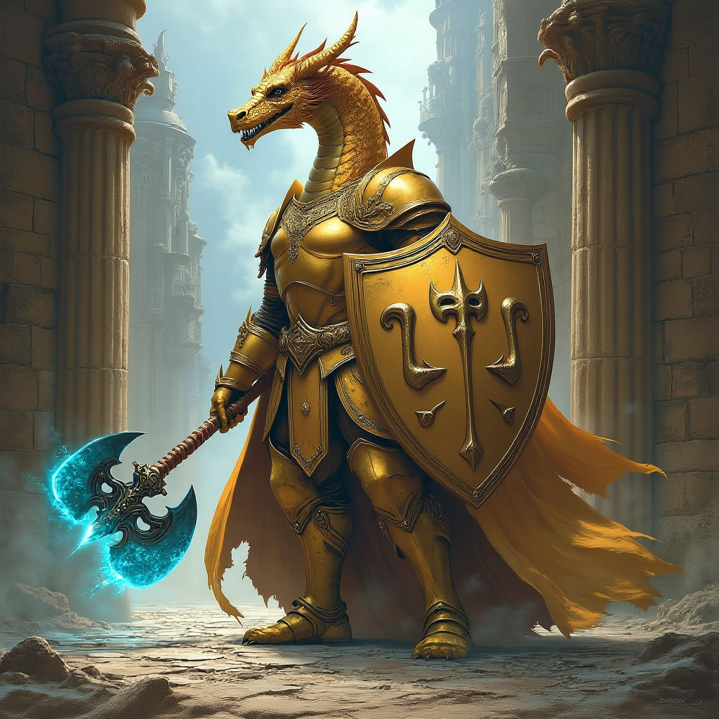 A digital painting shows a wingless, golden-scaled dragon humanoid paladin in ornate armor. He stands ready to defend an ancient city, holding a glowing axe and a shield bearing scales.