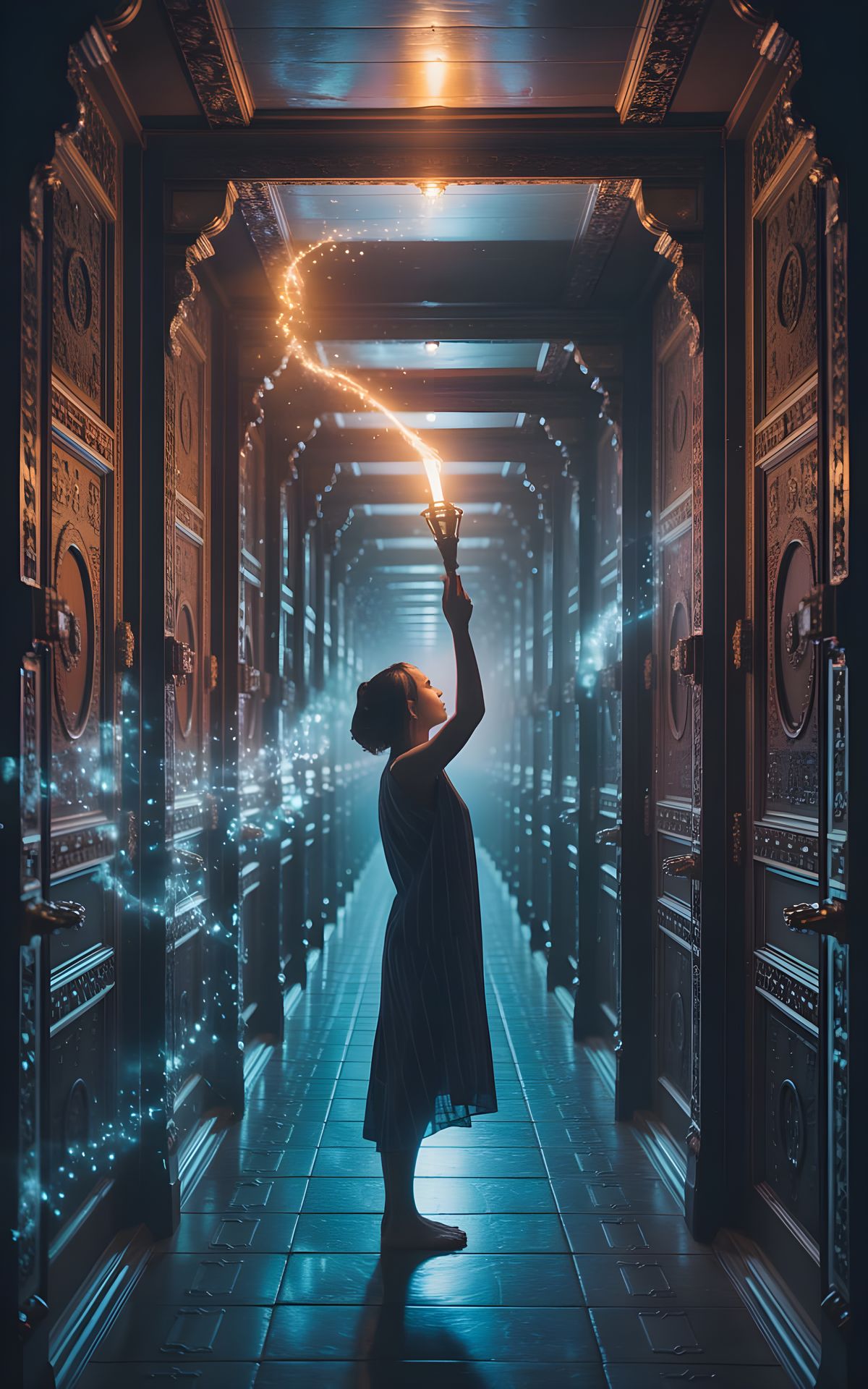 A surreal image shows an infinite corridor with glowing doors and unknown symbols. A barefoot traveler holds a torch, illuminating a dreamlike hallway filled with bioluminescent haze, creating a surreal, cinematic scene.