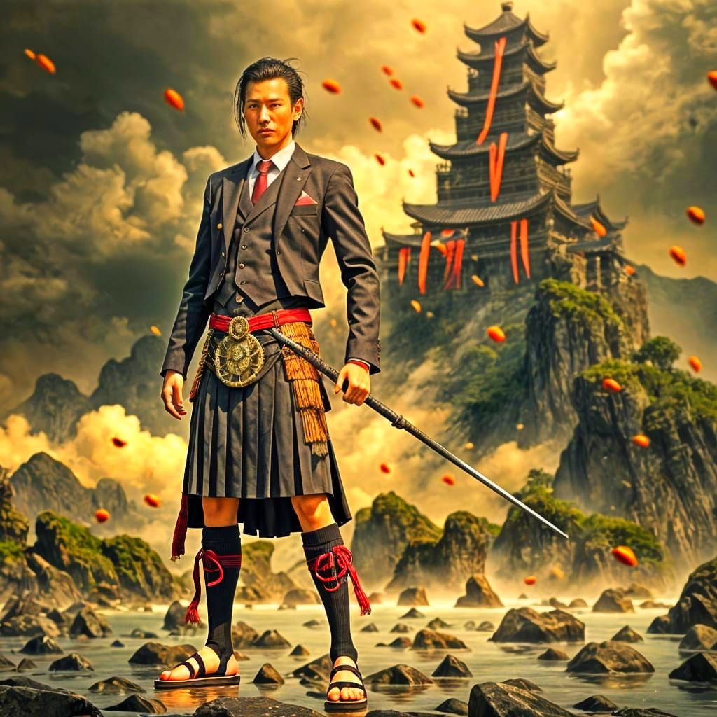 This image shows a tall, athletic Japanese man in a suit and black kilt. He exudes an intense and alert demeanor, standing tall in simple sandals.